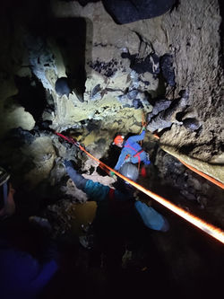 Trip Report 2nd Jan 2026 Rat Run West Gorge System. Nathaniel, Peter, Oisin This cave was found in 2018 by a group of cavers, it subsequently had a collapse and was left unexplored until Ray rediscovered it and stabilized it using scaffold. The cave itself is very tight, with seldom any room to sit up, demanding and slow crawl/ worming all the way through. Given the small nature of the cave small bottles were required so I borrowed a set of Ray's 3L bottles and requested the